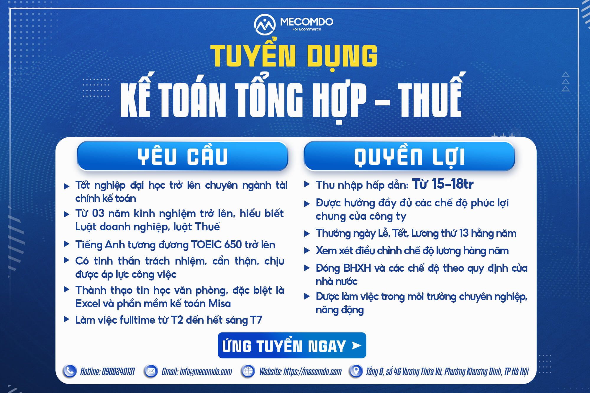 – Thu nhập: Theo năng lực và kinh nghiệm của ứng viên từ 15tr-18tr
